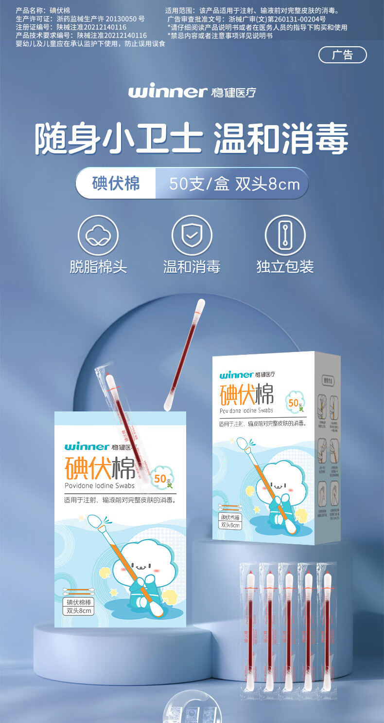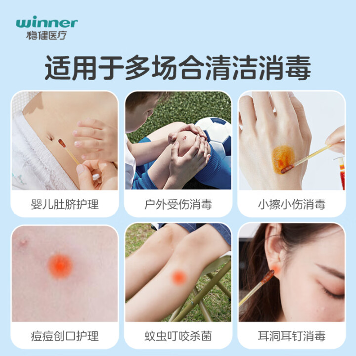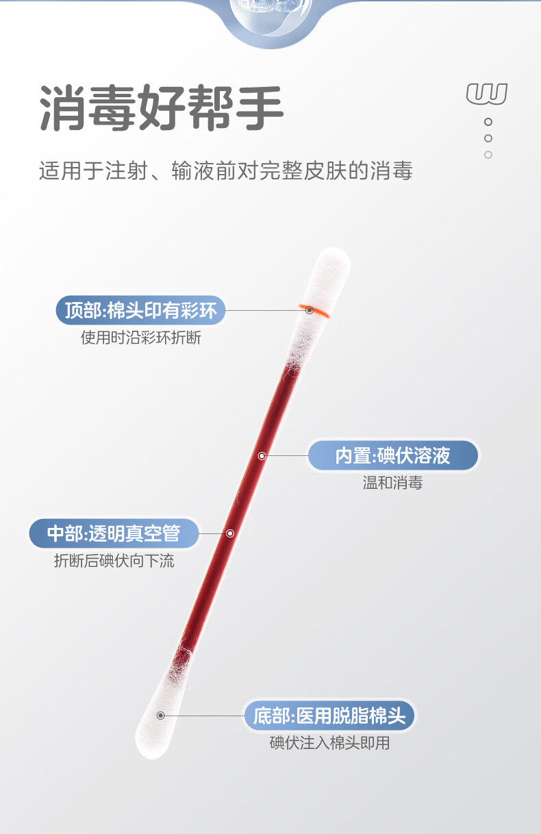 稳健医用碘伏消毒液棉签棉棒50支/盒 独立装双头折断式棉签成人婴儿