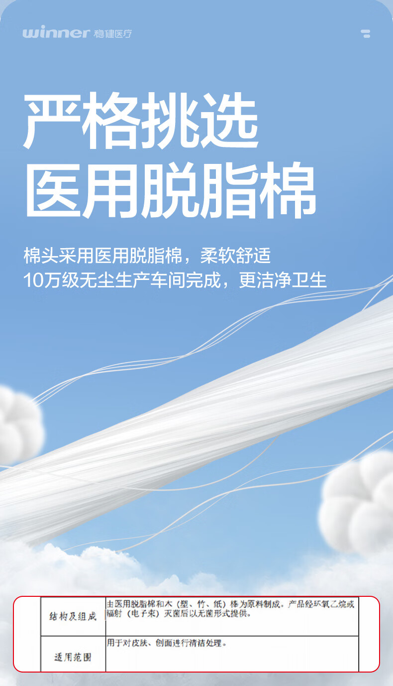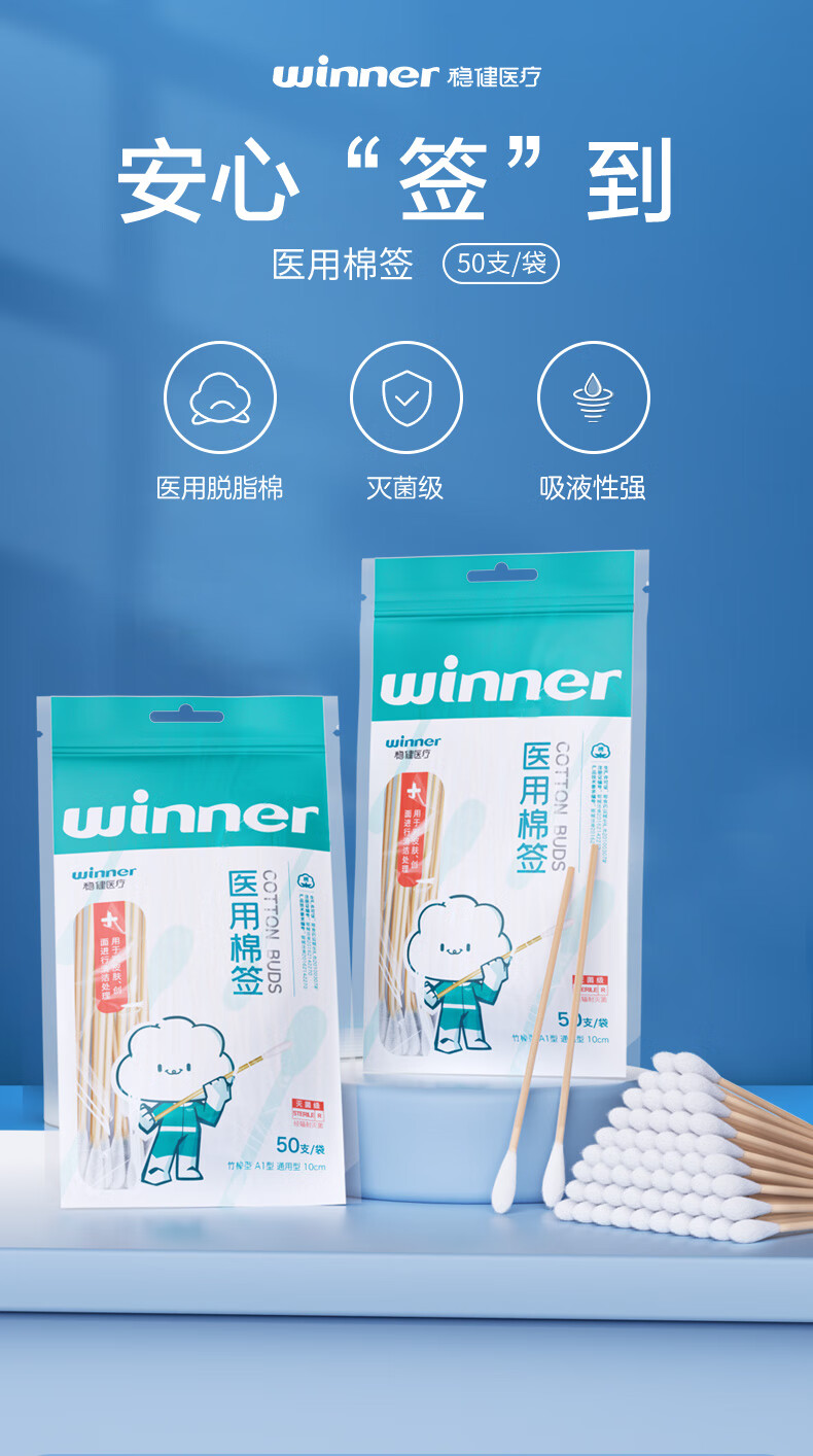 稳健一次性医用无菌消毒棉签50支上药清洁消毒化妆棉棒(凑单用)