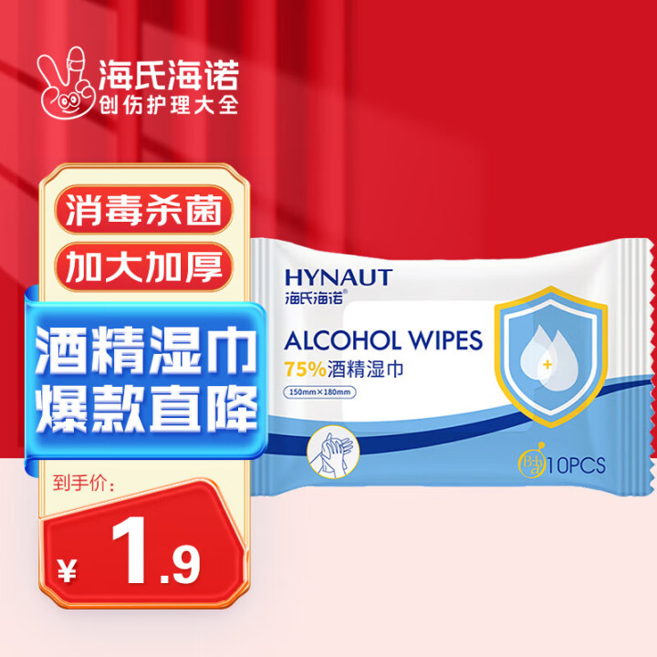 海氏海诺75%酒精湿巾一次性消毒棉片大号清洁湿巾小包10片凑单1元2元商品